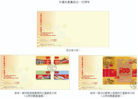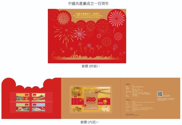 香港郵政早前宣布將於7月1日發行以「中國共產黨成立一百周年」為題的紀念郵票及相關郵品,今日(28日)除公布郵票、郵票小型張及首日封樣式及定價外,亦公布套摺的樣式。