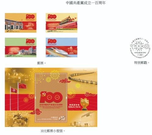 一套四枚郵票及一張郵票小型張分別定價15.6元及10元,引用了中國共產黨成立100周年慶祝活動的唯一官方指定標識,包括圖案及主題名稱引用於郵票設計內,而標識內之56根光芒線寓意中國共產黨奮進之光照耀中華大地。郵票將光芒線延伸,在鮮紅的黨旗飄揚下,串連每一枚郵票,分別展示黨領導新中國的成立和發展,實現為人民謀幸福、為民族謀復興、為世界謀大同的目標。以特別郵戳蓋銷首日封的一套四枚郵票及一張郵票小型張分別定價20.1元及14.5元。
