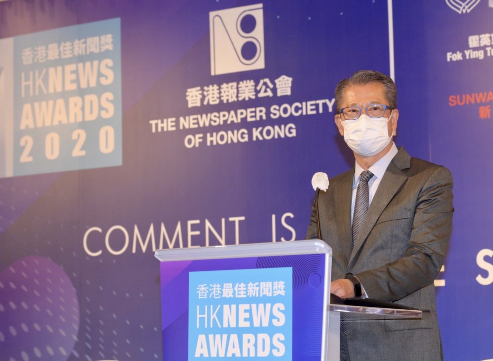 財政司司長陳茂波今日(4日)出席2020年香港最佳新聞獎頒獎典禮致辭時表,大眾需要專業、公正及客觀的傳媒,可以對政府起到督促和提點作用,幫助社會持續進步。