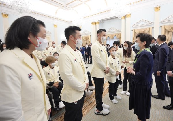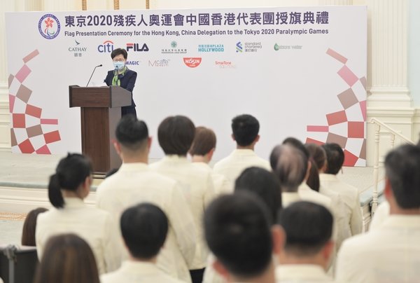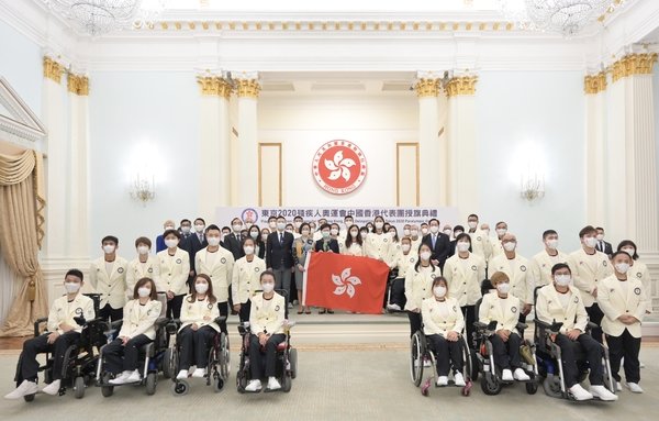 特區政府今日下午在禮賓府舉辦授旗儀式,林鄭月娥頒授區旗予港隊團長胡小玲及兩名運動員代表,分別是硬地滾球代表梁育榮,以及游泳代表陳睿琳。林鄭月娥致辭時表示,日前結束的東京奧運,中國香港代表隊取得有史以來最好的成績,社會的氣氛熱烈,相信會為殘疾運動員參賽創造最理想的氛圍,又讚揚殘奧港隊在疫情下,仍然鍥而不捨,積極備戰,展現堅韌的意志及拼搏精神,令人敬佩,相信所有運動員會以最高昂的士氣,出戰東京殘奧運,旗開得勝,凱旋歸來。
