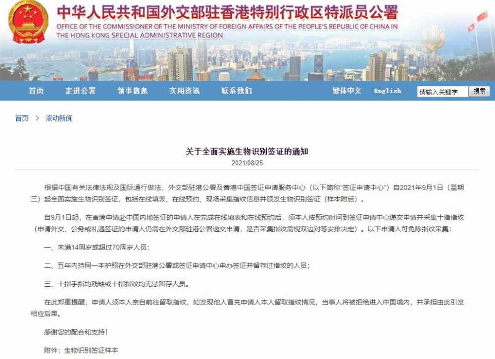 據外交部駐港公署網站消息,根據中國有關法律法規及國際通行做法,外交部駐港公署及香港中國簽證申請服務中心(以下簡稱「簽證申請中心」)自2021年9月1日(星期三)起全面實施生物識別簽證,包括在線填表、在線預約、現場採集指紋信息並頒發生物識別簽證(樣本附後)。