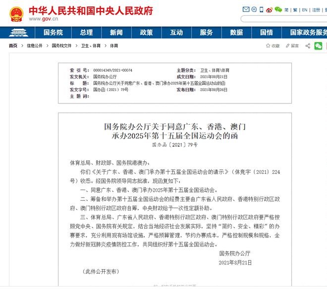 據中國政府網消息,國務院辦公廳近日發布《國務院辦公廳關於同意廣東、香港、澳門承辦2025年第十五屆全國運動會的函》,同意廣東、香港、澳門承辦2025年第十五屆全國運動會。