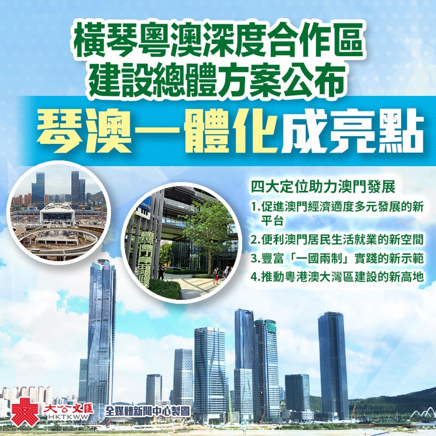 新華社今日(5日)發布消息指,近日,中共中央、國務院印發了《橫琴粵澳深度合作區建設總體方案》,並發出通知,要求各地區各部門結合實際認真貫徹落實。