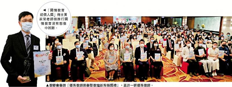 為凝聚專業力量,表揚教師的專業貢獻,教聯會昨日舉辦第16屆「優秀教師選舉暨教壇新秀頒獎禮」,有43名老師獲「優秀教師」、12名獲頒「教壇新秀」。有中學老師把國情教育結合體育、藝術課堂教學,讓學生從國家奧運健將為切入點,學習他們的拚搏精神,由此引發共鳴,再進一步推動國情教育。\大公報記者