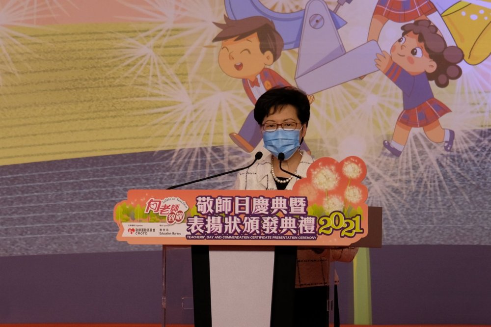 林鄭月娥感謝各位老師堅守崗位,秉持專業,期望老師繼續幫助學生建立正面的價值觀。她呼籲教育界攜手讓教育正本清源,致力培養有國家觀念、香港情懷、國際視野和社會承擔的新一代;並繼續同心抗疫,接種疫苗,為校園和社區的健康共同努力。