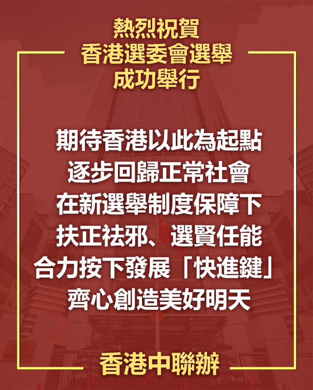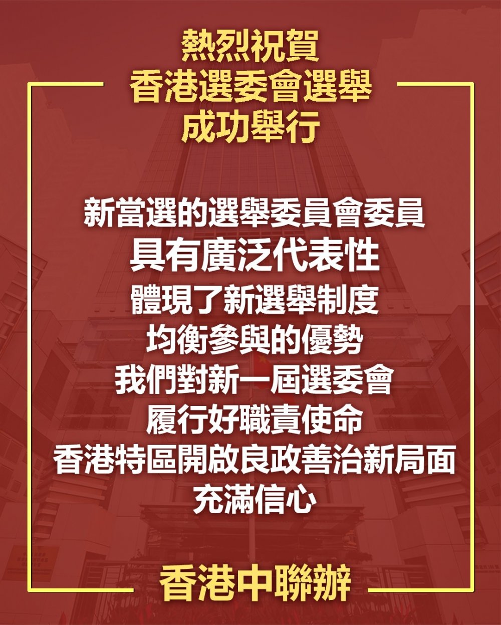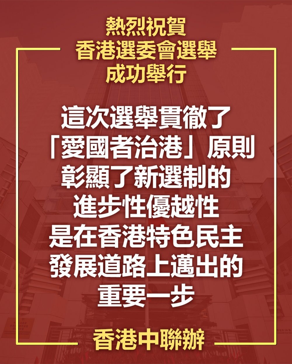 9月20日,香港中聯辦發表聲明表示,香港特區2021年選舉委員會界別分組一般選舉昨日圓滿結束,1448名新一屆選舉委員會委員順利產生。對此,香港中聯辦表示熱烈祝賀!這次選舉貫徹了「愛國者治港」原則,彰顯了新選制的進步性優越性,是在香港特色民主發展道路上邁出的重要一步。