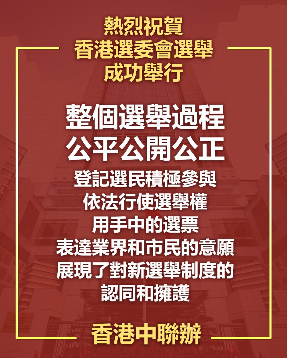 聲明指出,此次選委會選舉是香港局勢實現由亂及治重大轉折後迎來的首場重要選舉。特區政府嚴格依法組織選舉,從選民登記、參選報名、競選,到選民投票、計票,整個選舉過程公平公開公正。參選人圍繞反映業界訴求、解決香港經濟民生問題、推動社會進步、融入國家發展大局等提出競選政綱,與廣大市民深入交流互動,展現了為選民發聲、為香港建言的責任擔當。登記選民積極參與、依法行使選舉權,用手中的選票表達業界和市民的意願,展現了對新選舉制度的認同和擁護。