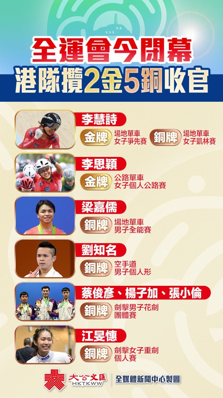 第十四屆全運會將於今晚(27日)閉幕。港隊今屆派出169名運動員,出戰18項決賽項目,以2金5銅共7面獎牌收官,其中2金2銅,來自港隊傳統強項單車項目,李慧詩在場地單車爭先賽收獲一金,公路單車賽事的李思穎為港隊奪下第二金。不過,過去幾屆都有獎牌的馬術項目,今屆卻遺憾與獎牌無緣。