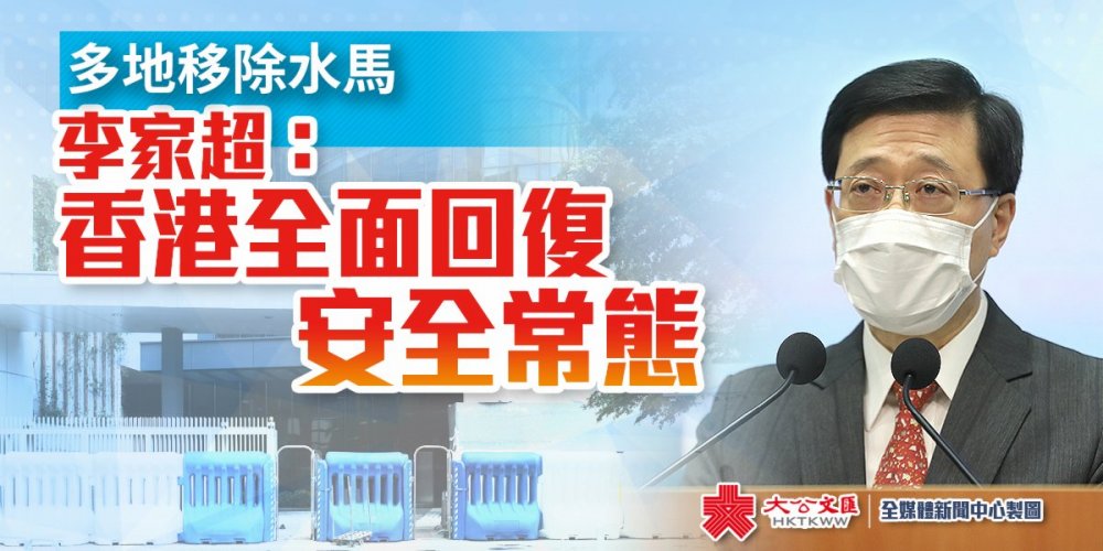政府總部及立法會大樓外設置超過兩年的大型水馬,昨晚開始陸續移除。政務司司長李家超今日(3日)發表網誌,指政府總部是管治核心的標誌,再展安全面貌,象徵香港安全、穩定和信心。至於其他地方的水馬,亦已被移除或即將移除,香港全面回復安全常態。