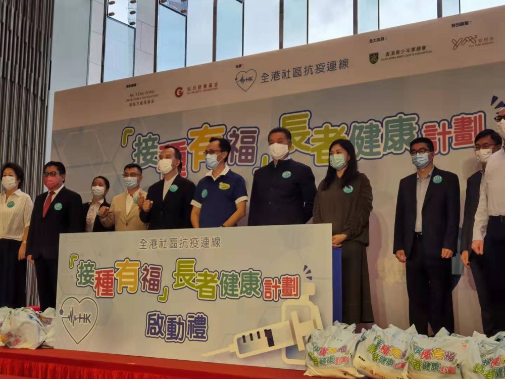 由「全港社區抗疫連線」發起的「接種有福」長者健康計劃啟動禮今早(3日)於觀塘裕民坊商場舉行,該計劃將通過健康講座等方式,為有疑慮的長者解惑,希望提高長者疫苗接種率。公務員事務局局長聶德權、經民聯主席盧偉國、全港社區抗疫連線總召集人陳振彬、陳勇、蘇長榮等多人出席活動。
