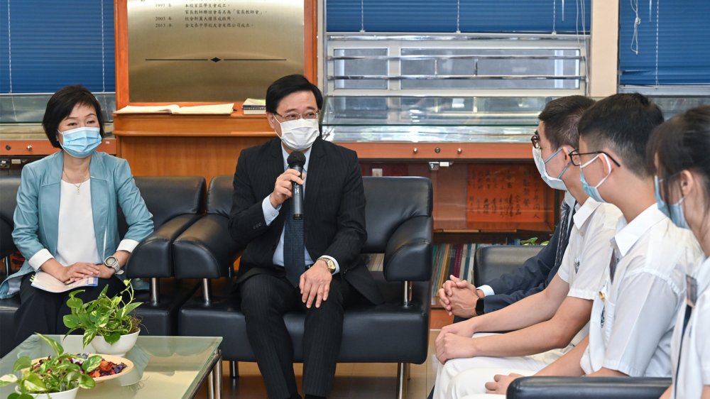 李家超在教育局副局長蔡若蓮陪同下觀看由學校升旗隊執行的升旗禮。之後,他與同學交流,當中有曾參加今年六月及九月舉行的「航天科學家團隊進校園」及「『時代精神耀香江』之仰望星空話天宮」活動的同學,他們分享了興奮之情和感受,更談及從國家航天員和專家們所學到的寶貴知識。