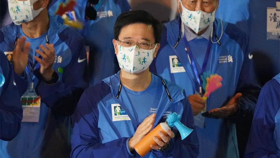 香港渣打馬拉松疫情下復辦,共有逾1.8萬名跑手參賽,今早由署理行政長官李家超主持起步禮,警務處處長蕭澤頤亦在主禮台上,為賽事揭開序幕。