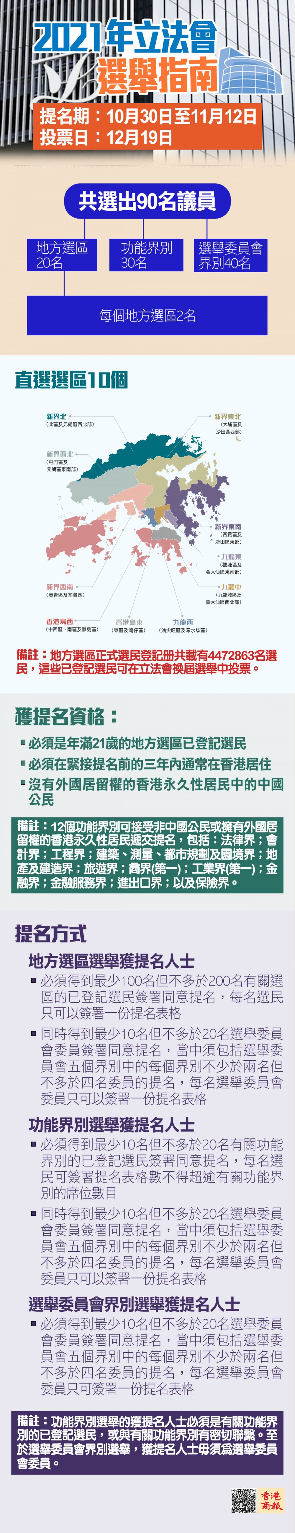 2021年立法會選舉提名期今日(30日)開始,為期兩周,至11月12日結束。立法會換屆選舉將於12月19日舉行,由地方選區選出20名議員、功能界別選出30名議員和選舉委員會界別選出40名議員,合共選出90名議員。