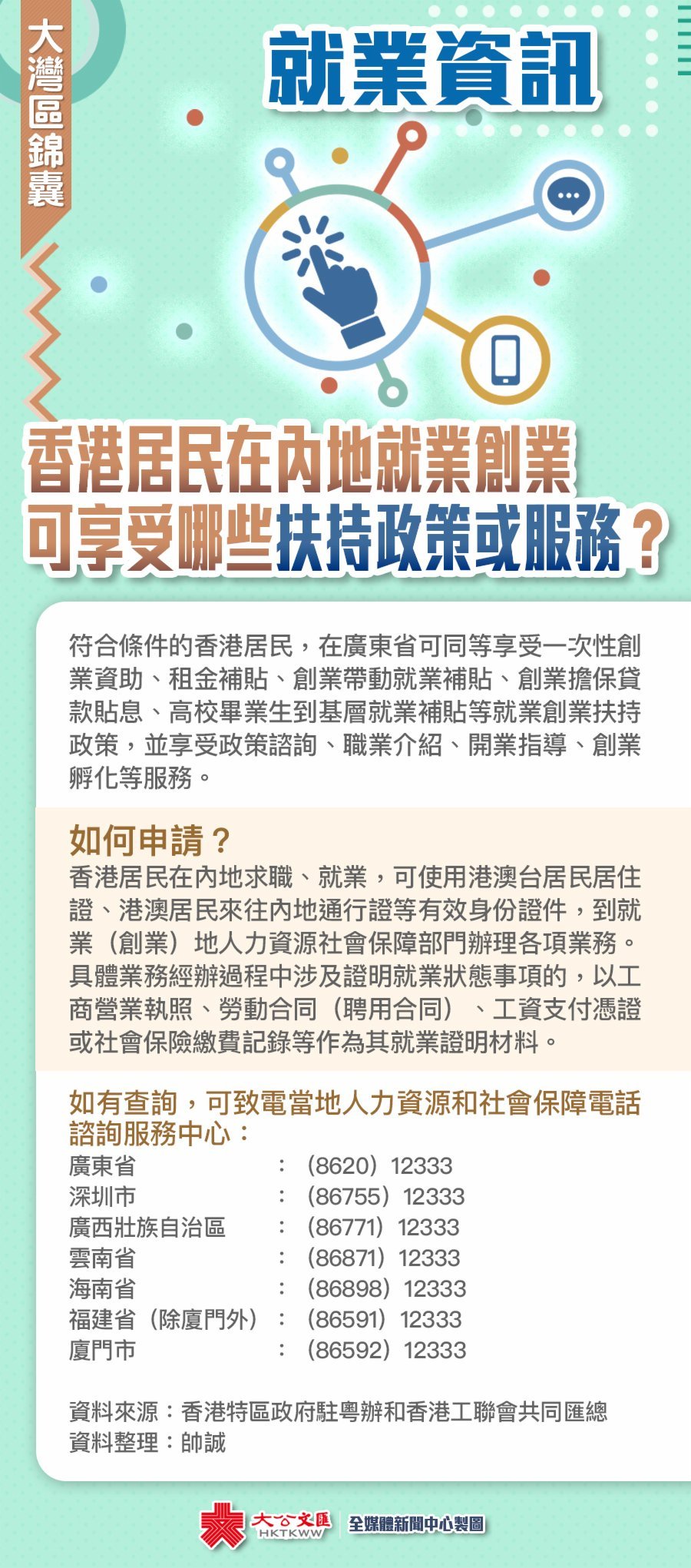 近年來,針對港澳青年到內地就業創業的各項優惠政策和配套措施越來越完善。數據顯示,2019年2月至今年4月,中央和地方各級政府已陸續出台231部涉粵港澳大灣區相關政策文件,其中就業創業佔比23%,是關注度最高的領域。那麼香港居民在內地就業創業,能享受哪些扶持政策或服務?又應怎樣申請?一圖話你知!