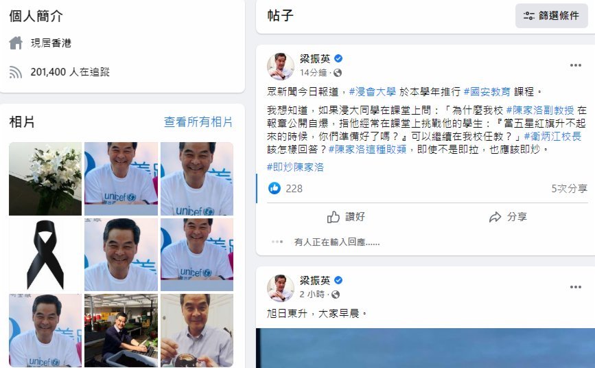 全國政協副主席、香港前行政長官梁振英今早(10日)在社交網絡發文,引述媒體報道香港浸會大學本學年推行國安教育課程一事時表示,對陳家洛這種公然挑戰國安法的敗類,即使不是即拉,也應該即炒。