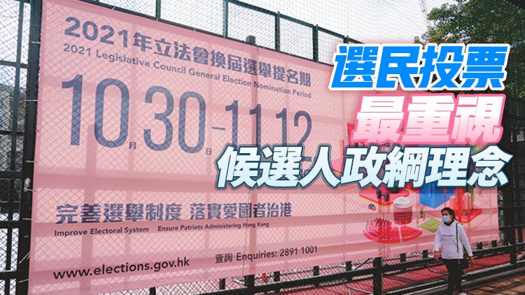 選民投票最重視候選人政綱/參政理念。另外,當問及影響受訪者投票取向的最主要因素時,最多受訪者表示為候選人的「政綱/參政理念」(26%),隨後依次為「過往工作表現」(18%)、「政黨背景/政治立場」(16%)、「與選民的互動接觸」(10%)及「候選人形象」(9%),表示「其他」的佔百分之九,而表示「無意見」的則佔一成二。