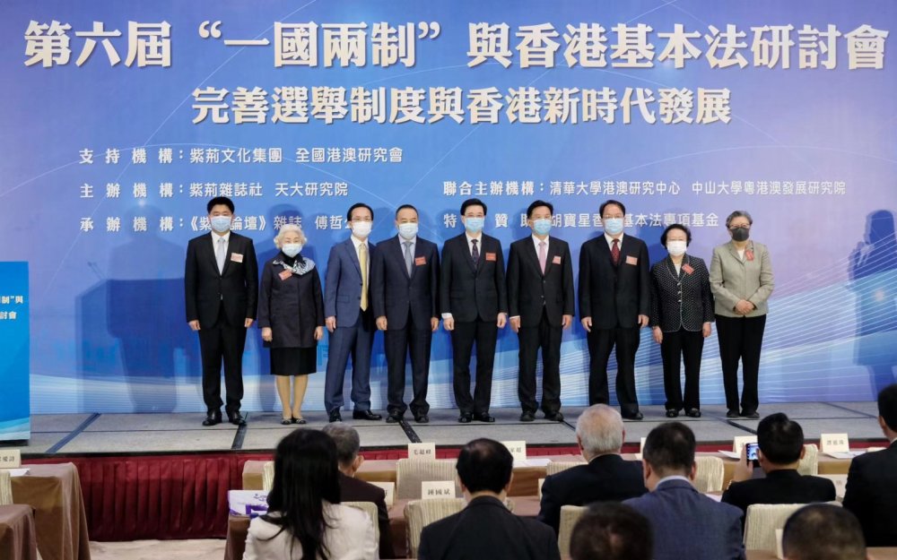 「完善選舉制度與香港新時代發展」第六屆「一國兩制」與香港基本法研討會今日(20日)舉辦,分為開幕式、主旨演講、理性討論三個環節。研討會邀請到香港特區政府政務司司長李家超,中央政府駐港聯絡辦秘書長王松苗,外交部駐港特派員公署副特派員潘雲東,紫荊文化集團董事長毛超峰,天大研究院董事長方文權,全國人大常委會香港基本法委員會副主任譚惠珠,全國人大常委會香港基本法委員會前副主任、香港特區政府律政司首任司長梁愛詩,全國人大常委會前委員、香港特區首任立法會主席范徐麗泰,紫荊雜誌社社長楊勇擔任主禮嘉賓。