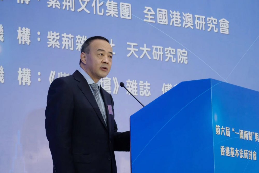 開幕式上,紫荊文化集團毛超峰董事長代表主辦方致歡迎詞時表示,不久前召開的中國共產黨十九屆六中全會審議通過了《中共中央關於黨的百年奮鬥重大成就和歷史經驗的決議》,其中指出,在堅持「一國兩制」和推進祖國統一上,中央實施一系列標本兼治的舉措,推動香港局勢實現由亂到治的重大轉折,為推進依法治港、促進「一國兩制」實踐行穩致遠打下了堅實基礎。在這個重要時刻召開研討會,可謂恰逢其時,相信大家也會有很多新體會和新思考,能在研討交流中相互碰撞、凝聚共識,為「一國兩制」的實踐提供寶貴的理論借鑒。香港是法治社會,法治是全社會共同守護的核心價值,紫荊文化集團及其在港機構將不遺餘力推動法治尤其是憲法、基本法和國安法的研究與宣傳,使「一國兩制」的法治文化深入人心,在香港社會形成認同國家,尊崇憲法、基本法和國安法的良好法治氛圍。