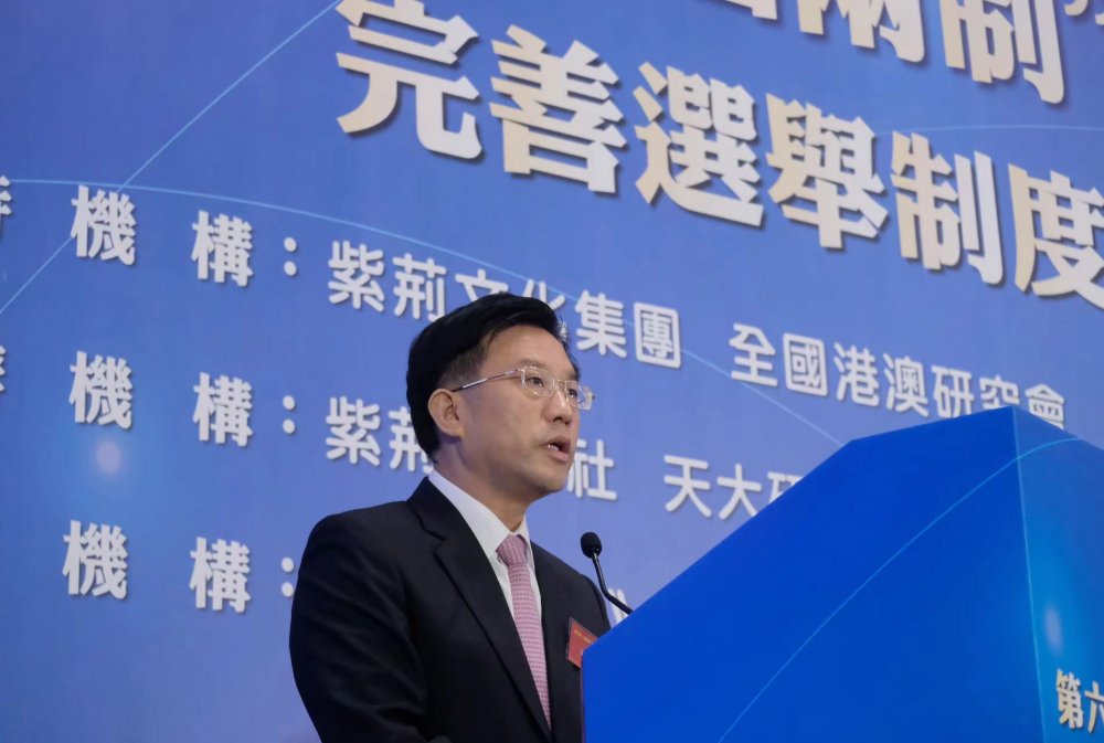 全國港澳研究會會長徐澤通過視頻致辭時表示,當前,香港特別行政區第七屆立法會選舉正在有序進行中。主辦方在此時召開「完善選舉制度與香港新時代發展」的研討會,對深入理解完善選舉制度對香港新發展所具有的里程碑意義必將大有裨益。他說,目前,來自香港社會各階層、各界別、各方面的人士積極參選競選,候選人專業、理性地宣介政綱,「泛政治化」現象絕跡,與以往反中亂港勢力製造對立、蠱惑民眾的亂象形成鮮明對比,同時不同政治光譜交錯存在,充分顯示完善香港選舉制度絕不是要搞狹隘的「清一色」,而是要在「愛國愛港」旗幟下團結一切可以團結的力量,找到最大公約數,尋求最大社會共識,為香港實現良政善治奠定最堅實廣泛的社會政治基礎。