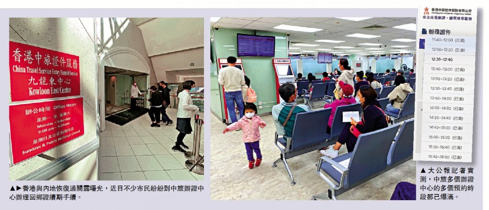 香港與內地恢復通關露曙光,市民心情雀躍,近日紛紛辦理回鄉證續期手續。中旅證件多個服務中心,昨日多個預約時段均告爆滿。