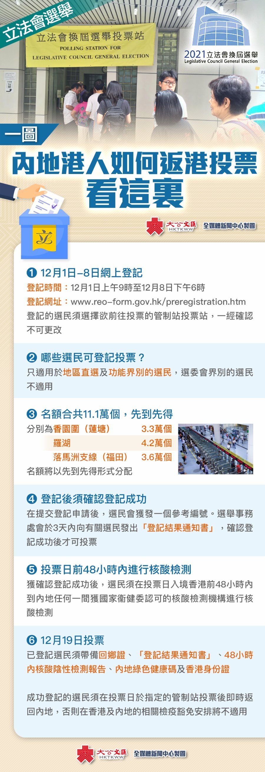 完善選舉制度之後的首場立法會選舉將於12月19日舉行,153名候選人角逐90個席位,全部90席都出現競爭。政府今日(29日)公布,將於投票日設立3個管制站投票站,包括香園圍、羅湖、落馬洲支線出入境管制站。屆時,內地出入境管制部門將臨時性啟用對應的蓮塘、羅湖、福田口岸,方便身在內地的選民返港投票。安排設有名額限制,將以先到先得形式分配,所有計劃前往管制站投票站的選民,必須預先進行網上登記(點此可登記投票)。點新聞為讀者整理了內地港人12月19日返港投票的流程及注意事項,快來睇下!