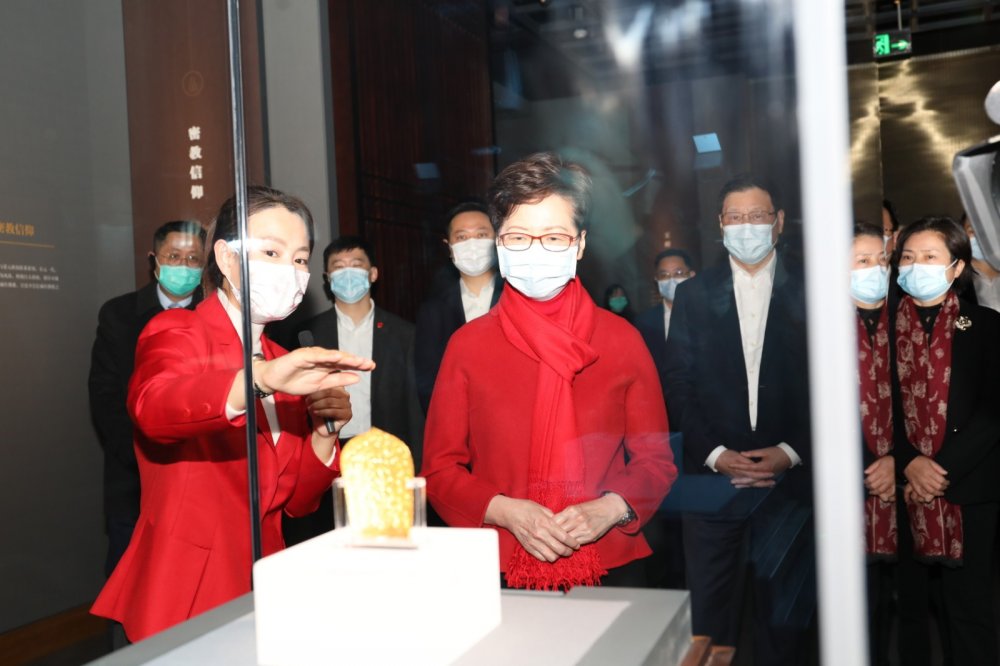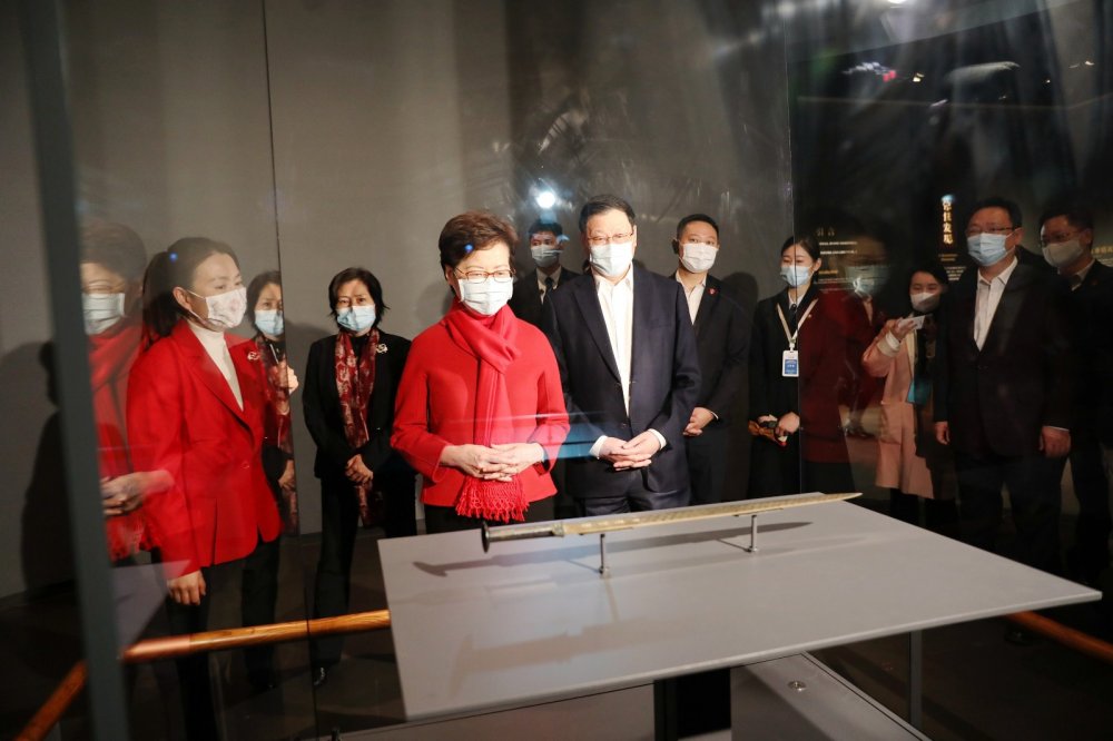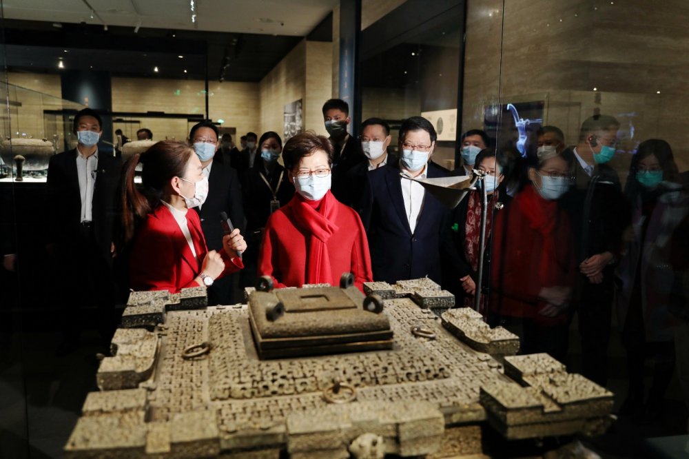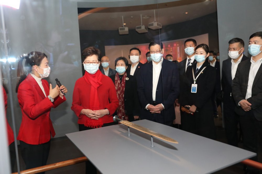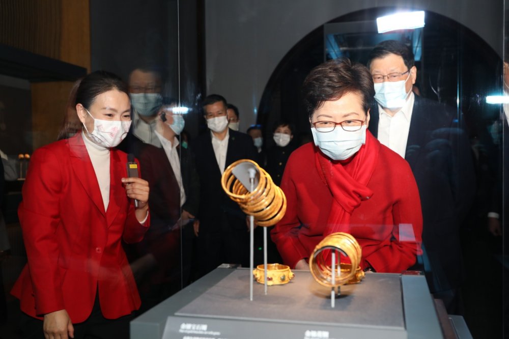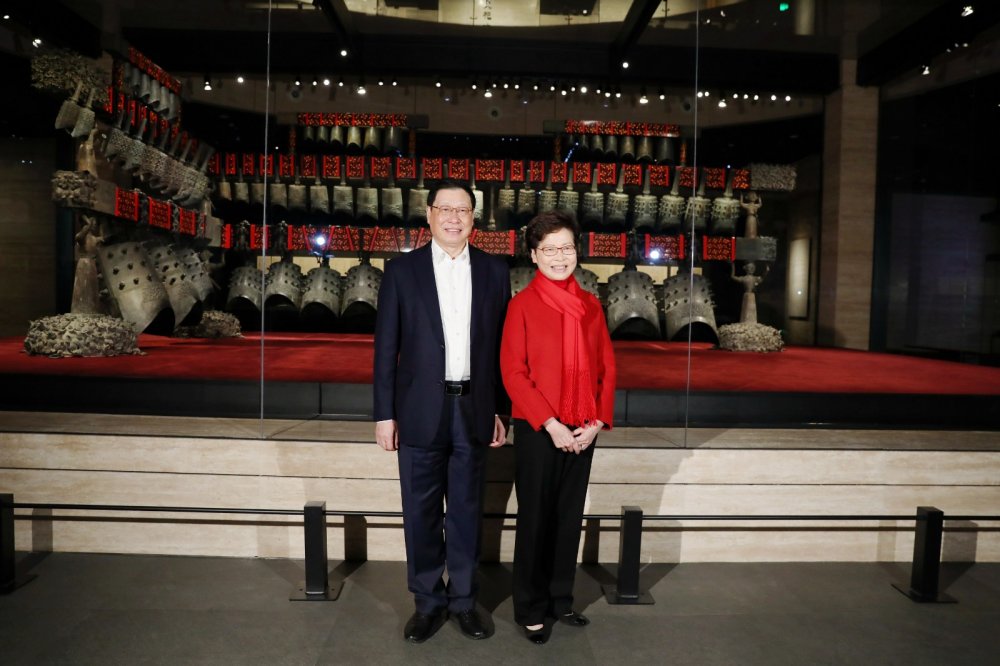 上午,林鄭在湖北省委書記應勇陪同下,到湖北省博物館新館考察當地的考古及文物保護工作。湖北省博物館是國家一級博物館,有近千件/套國家一級文物,擴建的新館本月剛竣工,總建築面積6.4萬平方米,外型獨特。林鄭月娥參觀新館的展品,包括重點藏品曾侯乙編鐘,並欣賞館方安排的編鐘演奏。她表示,香港故宮文化博物館將於明年中開幕,期望與湖北省博物館加強合作,在文物保護、珍貴藏品展覽和教育等範疇作更多交流。