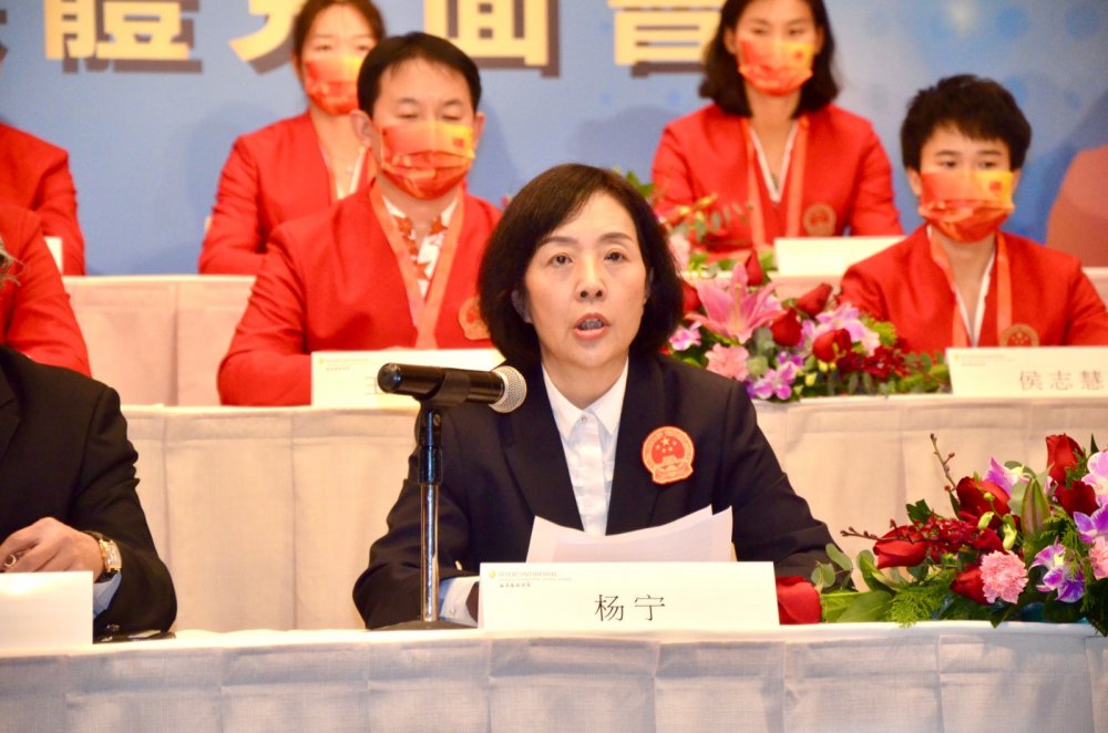 楊寧指出,香港運動員在東京奧運會亦獲得很好成績,張家朗奪得香港回歸以來首面金牌,展現香港健兒奮發進取的時代風采和香港青年昂揚的精神風貌。她又提及在乒乓球賽場,國家隊選手和香港隊選手分別獲得金牌和銅牌,並在升旗儀式後合影,展視中國青年團結奮進的良好形象和激勵。
