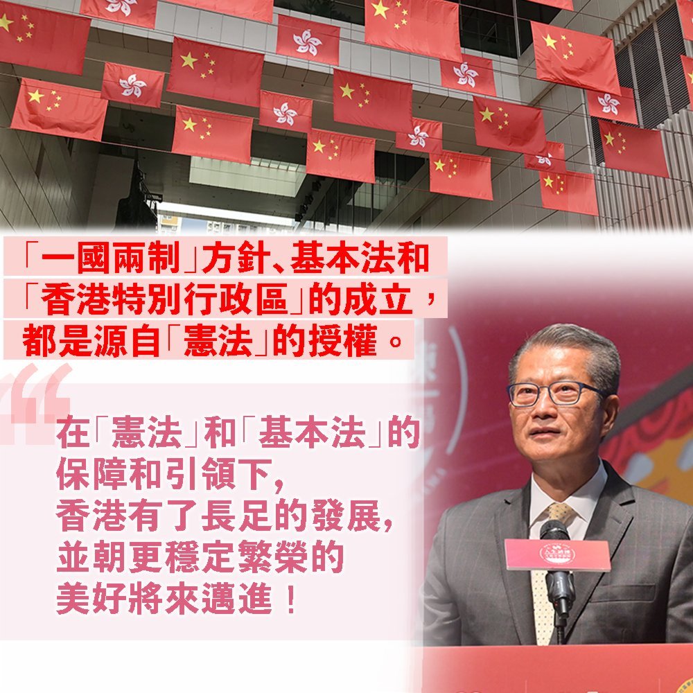 昨天(4日)適逢國家憲法日,特區政府和中聯辦合辦了座談會,以「憲法與『一國兩制』」為主題,探討《中華人民共和國憲法》與「一國兩制」的關係,以及香港如何在《憲法》的框架下更好落實「一國兩制」。財政司司長陳茂波今日(5日)發表網誌,指《憲法》是國家的根本法,是治國安邦的總章程,具有最高的法律地位和效力。《憲法》確立了國家的憲制秩序,也是《基本法》的立法依據和權力來源。《憲法》和《基本法》共同構成香港特區的憲制基礎。「一國兩制」的方針、《基本法》的存在和香港特別行政區的設立,依據都是源自《憲法》的授權。