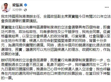 對此,梁振英在FB發文表示,支持國務院港澳辦主任、全國政協副主席夏寶龍今日有關2021年立法會換屆選舉的重要講話。