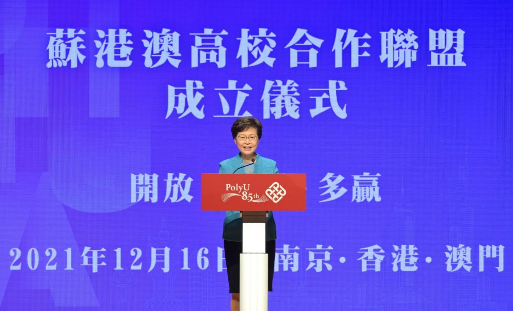 由南京大學、香港理工大學及澳門大學三校共同創立的「蘇港澳高校合作聯盟」今日(16日)正式成立,並於南京及香港同步舉行成立儀式。行政長官林鄭月娥致辭時表示,三地大學加強高等教育合作,有助促進科技創新和人才交流,推動產業發展,以及為大灣區一體化發展奠定基礎。期望聯盟秉持「開放、共享、多贏」的創盟理念,在科技創新、人才交流等領域進一步整合和發揮各方的優勢,為蘇港澳的學者和學生締造更多發展的機遇,為國家發展作出貢獻。