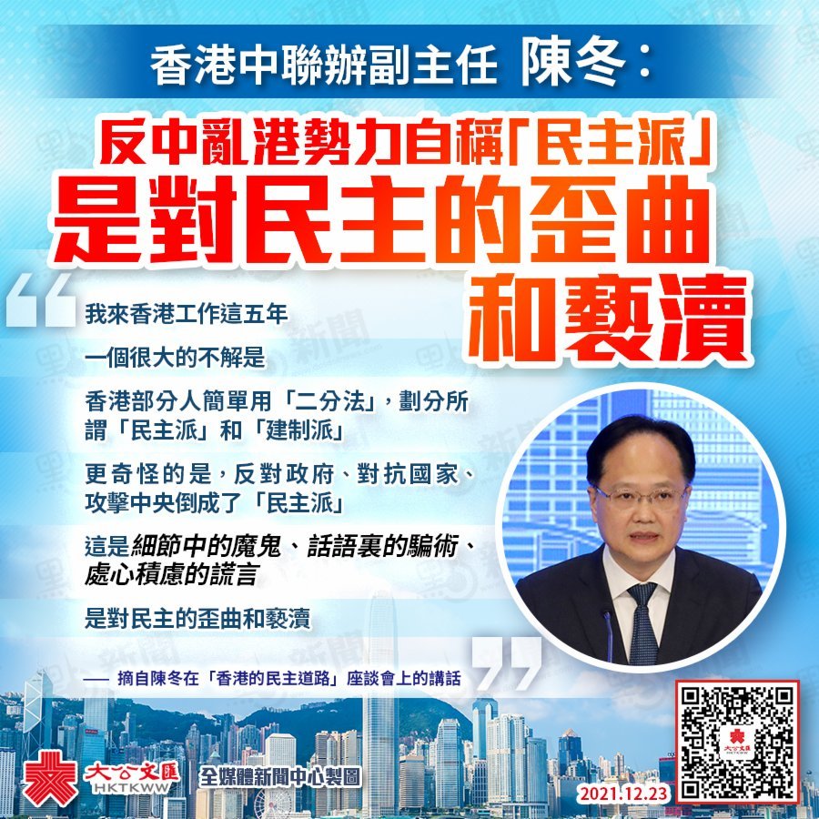 香港中聯辦於今日(23日)在香港會展中心舉辦「香港的民主道路」座談會,香港中聯辦副主任陳冬作主旨發言。陳冬說,他來香港工作這五年,一個很大的不解是,香港部分人簡單用「二分法」,劃分所謂「民主派」和「建制派」,非黑即白,非此即彼。更奇怪的是,反對政府、對抗國家、攻擊中央倒成了「民主派」,這是細節中的魔鬼、話語裏的騙術、處心積慮的謊言,是對民主的歪曲和褻瀆。
