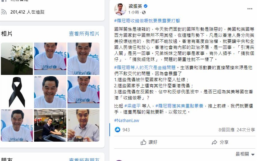 全國政協副主席、香港前特首梁振英今日(28日)在社交媒體發文表示,羅冠聰等人的死穴是金錢問題,生活費和活動費的直接間接來源是他們不敢交代的問題,羅冠聰收錢做嘢就要暴露就要揭發打擊。