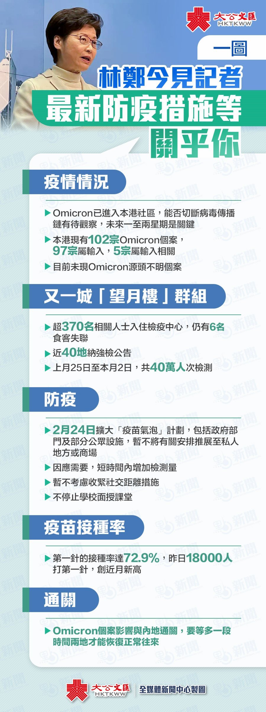 國泰航空有機組人員早前被揭違反防疫規例外出,引致Omicron變種病毒流入社區,出現「望月樓」群組。特首林鄭月娥今日(4日)出席行政會議前見記者,交代本港最新疫情情況及防疫措施等,提出為恢復正常生活和為「通關」創造有利條件,必須提升接種率,2月24日起擴大「疫苗氣泡」要求。