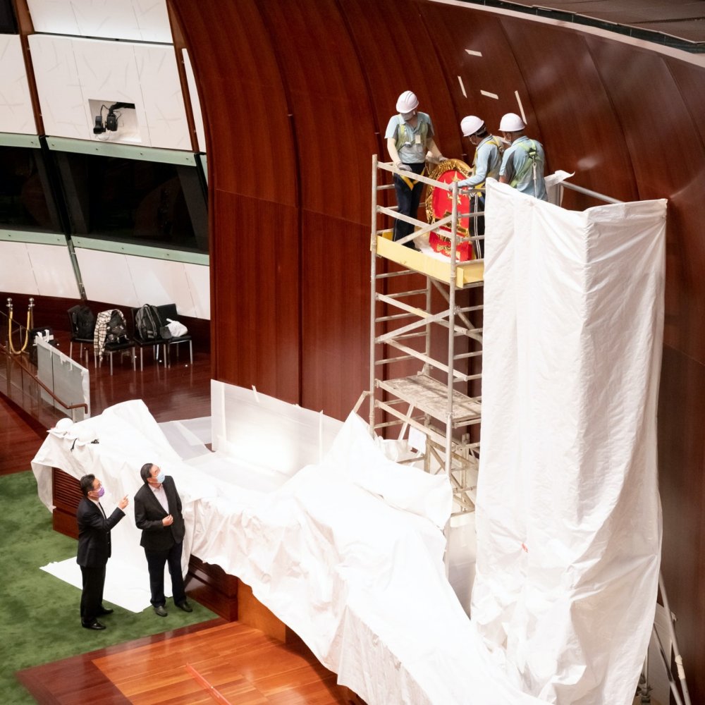 立法會行政管理委員會早前決定,在立法會會議廳同時懸掛國徽及區徽,預料將於下周三(12日)召開首次大會前完成。立法會主席梁君彥今早(6日)與立法會秘書長視察會議廳懸掛國徽及區徽的工程進度,指有了國徽,會議廳將更莊嚴。