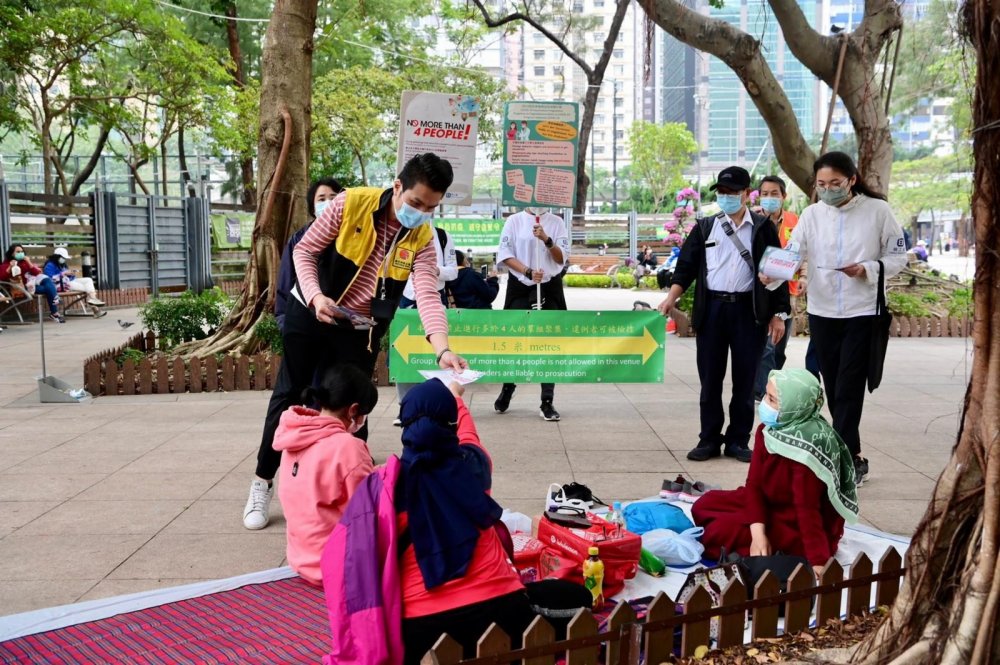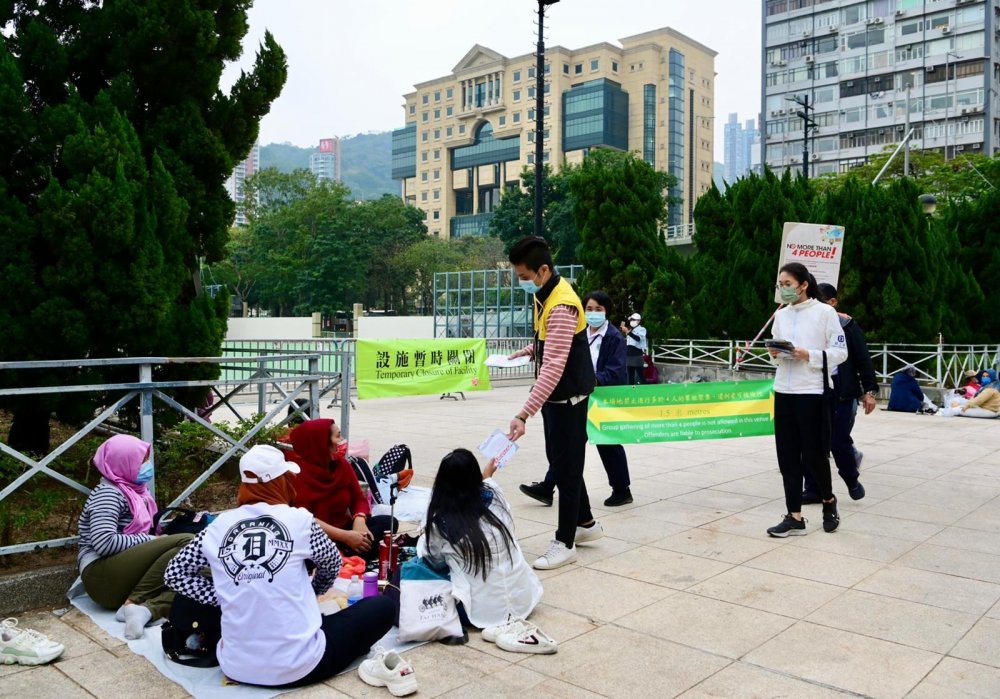 署方今日繼續和相關部門,在轄下康樂及文化場地加強巡邏,呼籲使用場地人士遵守規定,並檢控經勸喻仍不遵守規例者。署方人員在轄下場地巡邏期間,亦向外籍家庭傭工派發宣傳單張,同時透過場地廣播及告示牌,呼籲他們遵守有關法例規定。
