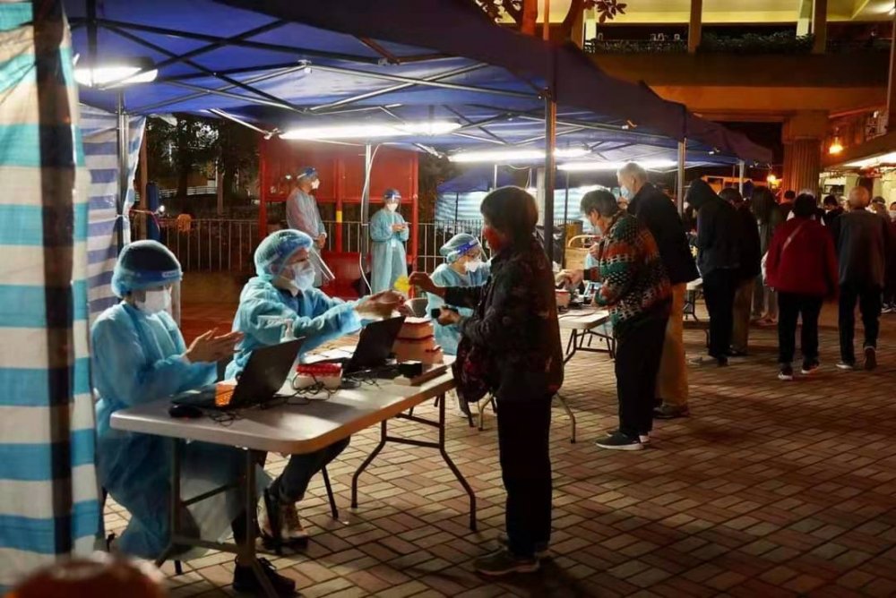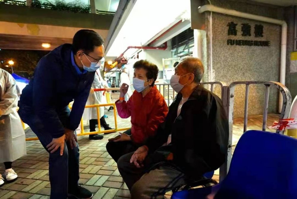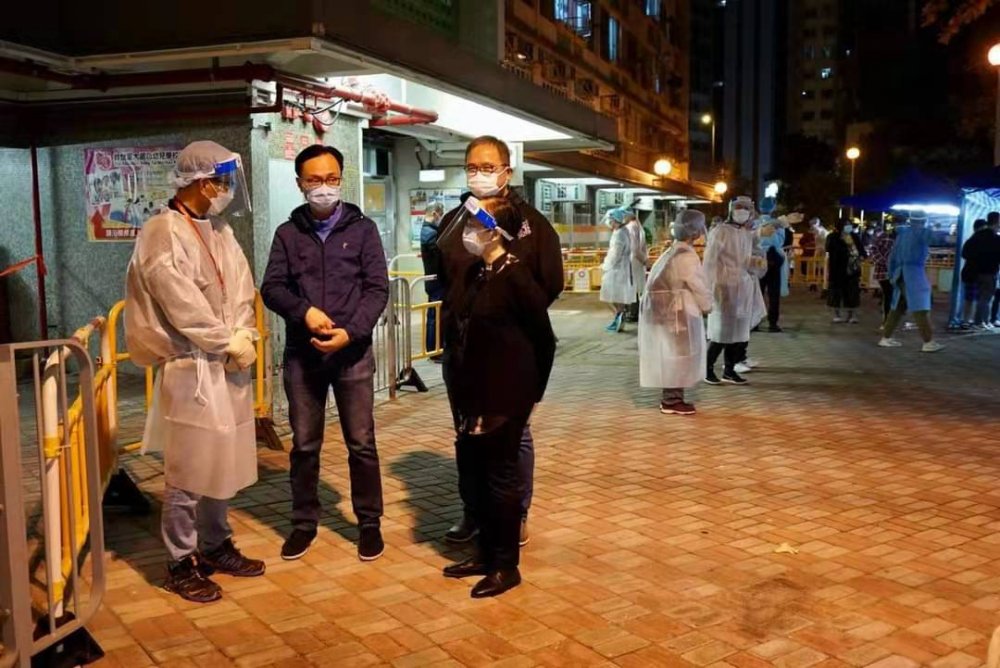 聶德權昨天(23日)晚上到大窩口邨須進行圍封強檢的富強樓視察,為同事打氣。這次行動由西貢民政專員和同事跨區帶領,同時有來自環保署和物流署的公務員支援,加上警方和房署同事協助,與檢測承辦商配合,大家齊心合力,把工作做好。