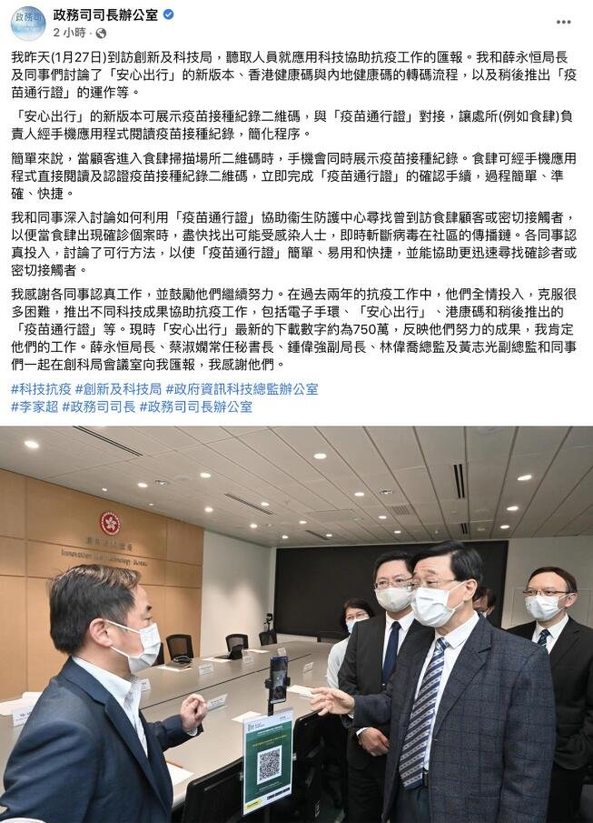 政務司長李家超今日(28日)在社交網站發文,指昨天到訪創新及科技局,聽取創科局人員就應用科技協助抗疫工作的匯報,並討論如何利用「疫苗通行證」協助衞生防護中心尋找曾到訪食肆顧客或密切接觸者,以便當食肆出現確診個案時,盡快找出可能受感染人士,即時斬斷病毒在社區的傳播鏈。