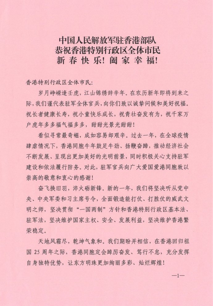中國人民解放軍駐香港部隊今天(29日)恭祝香港特別行政區全體市民新春快樂、闔家幸福。由中國人民解放軍駐香港部隊司令員彭京堂少將、政治委員蔡永中少將署名的公開信表示,在農曆新年即將到來之際,謹代表駐軍全體官兵,向香港特別行政區全體市民致以誠摯問候和美好祝福。祝長者健康長壽,祝小童快樂成長,祝青壯奮發有為,祝千家萬戶虎年多多福氣福多多,甜甜光景光甜甜!