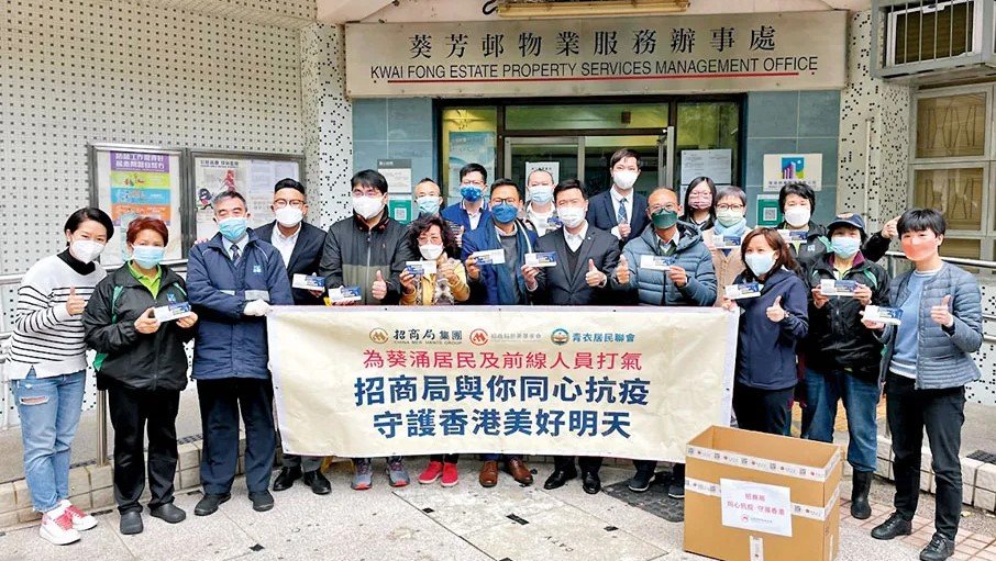 此外,招商局旗下物業管理公司更派出300多名員工進入葵涌邨,堅守涉疫社區,提供清潔、安保和病人轉運等服務,與圍封居民同心抗疫,並在1月31日下午,向葵涌邨社區抗疫捐贈了一批高級別防護用品,包括5000盒自行檢測包、1000盒ASTM3口罩、1000瓶消毒噴霧等。