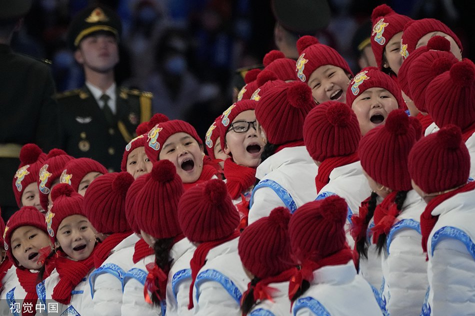 閉幕式現場演唱《奧林匹克頌》依然是來自河北省阜平縣山區的「馬蘭花童聲合唱團」。孩子們身上的服裝,裝飾了「連年有餘」的剪紙圖案。