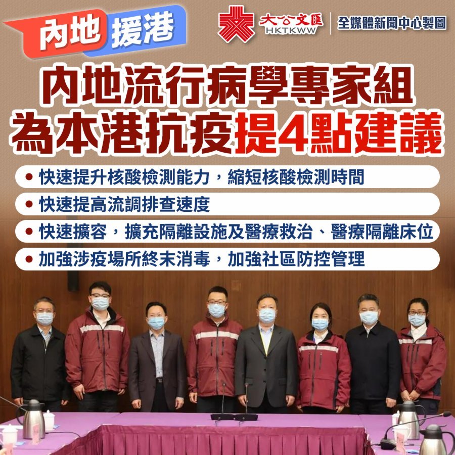 內地專家和檢測團隊陸續抵達香港,內地支援香港抗疫重症專家組繼續在香港考察,今日(21日)上午到訪威爾斯親王醫院,與醫管局代表針對新冠重症案例進行討論和研究。國家疾控局副局長、國家衞生健康委應急辦主任孫陽在接受電視台採訪時表示,17日抵達香港的首批內地支援香港抗疫流行病學專家組,針對香港疫情的特點、存在的問題,提出了四點建議,包括: