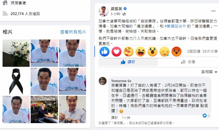 全國政協副主席、香港前行政長官梁振英今日(21日)早上在社交媒體貼文表示,加拿大貨車司機組成的「自由車隊」佔領首都渥太華,昨日被警察武力清場,加拿大司機的「違法達義」,和戴耀廷違法佔中的「違法達義」一樣,就是被捕、被檢控,失敗告終。