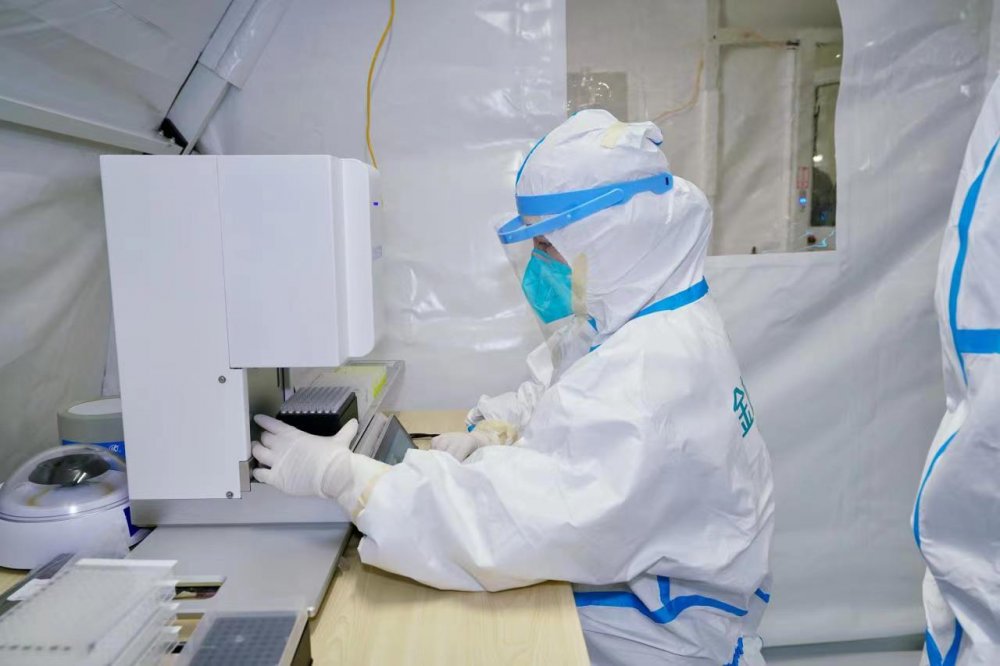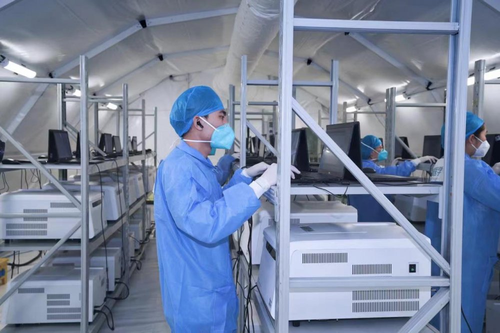 下午3點,第一批核酸檢測樣本送至「獵鷹號」,首批排班的檢測人員陸續進入各自負責的區域,開始工作。
