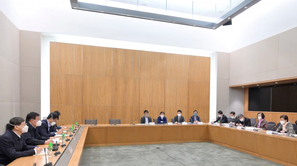 行政長官林鄭月娥與國家衞生健康委員會新冠疫情應對處置工作領導小組專家組組長梁萬年及其率領的內地專家組會面。林鄭月娥感謝梁萬年和各位專家實地調研特區抗疫工作。