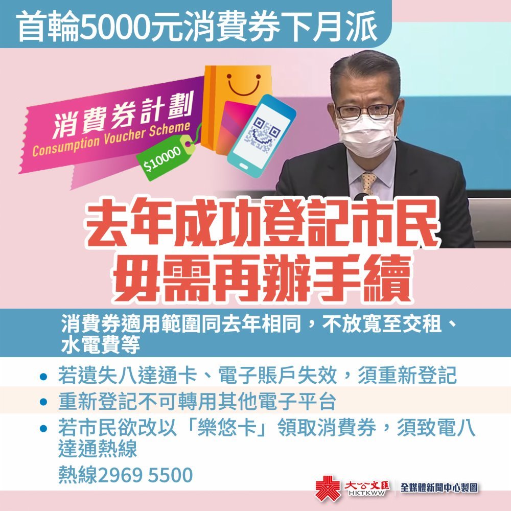 陳茂波指出,今年的消費券同樣分兩期發放,4月會先發放首期5000元,經去年4個發放的儲值及支付平台派發,餘下的5000元將於年中派發。陳茂波表示,消費券的適用範圍同上一輪相同;消費券為了盡快推出,暫時不會放寬至交租或交水電費等。
