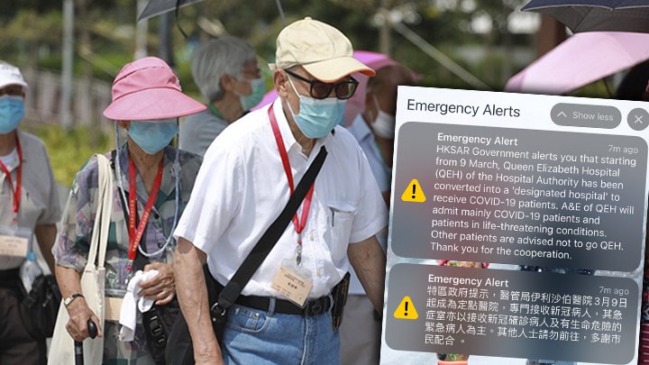 本港第五波疫情大爆發,當局今日傍晚近6時首次發出緊急警示,提醒市民伊利沙伯醫院今起轉為定點醫院,提醒市民切勿前往急症室求醫。有市民表示感到驚嚇,亦有人質疑政府是否濫用緊急警示系統。