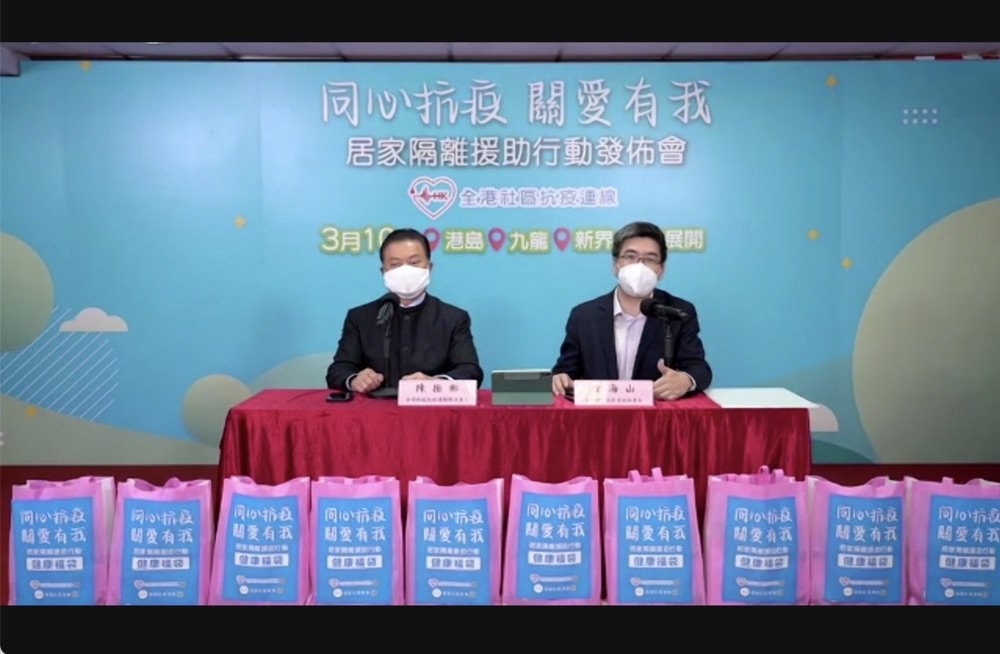 本港在第五波疫情下每日確診人數持續高企,不少市民仍在社區居家隔離,為協助這些市民並提供援助,由全港社區抗疫連線舉行「同心抗疫 關愛有我 居家隔離援助行動」網上發布會,共召集約4000名義工在本港十八區為他們提供抗疫物資、生活必需品,以及防護隔離資訊,發揮同舟同濟守護相助的精神。