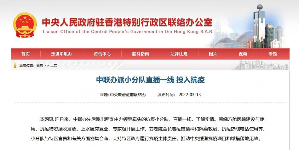 香港中聯辦網站消息,連日來,香港中聯辦先後派出兩支由辦領導牽頭的抗疫小分隊,直插一線,了解實情。圍繞方艙醫院建設與使用、抗疫物資接收發放、上水屠房復業、專家組開展工作、安老院舍長者疫苗接種和隔離救治、抗疫熱線電話使用等,小分隊與特區官員和有關方面密集會商,支持特區政府履行抗疫主體責任,推動中央援港抗疫項目和舉措落地見效。