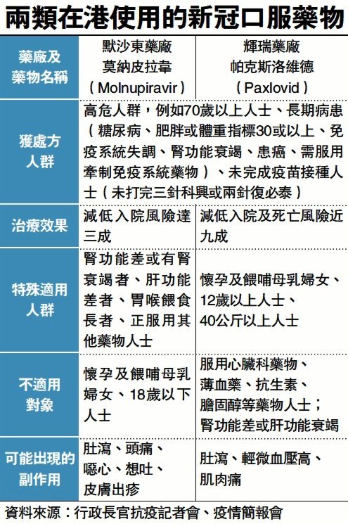 醫管局總行政經理劉家獻亦指,已訂購的默沙東口服藥抵港後,開始處方給病人服用,效果良好。輝瑞藥廠的口服藥會陸續派到醫院、指定診所和老人院。而兩款藥物都是一日食兩次,療程五日。