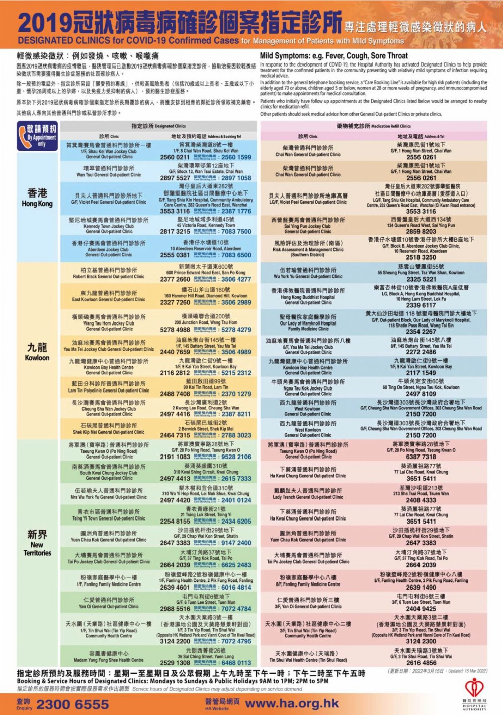 本港第五波疫情嚴峻,今日(17日)新增21650宗確診個案;第五波疫情至今,累計超過98萬人染疫。醫管局總行政經理(質素及標準)劉家獻今日在疫情記者會上表示,現時社區確診者可透過預約電話及關愛預約專線預約23間指定診所,由明天(18日)上午7時開始,除了電話預約以外,市民可透過手機應用程序「HA Go」的預約指定診所功能,預約23間指定診所。